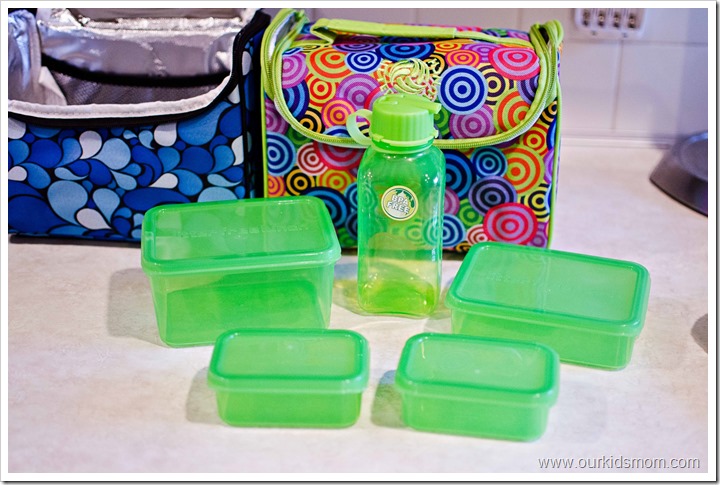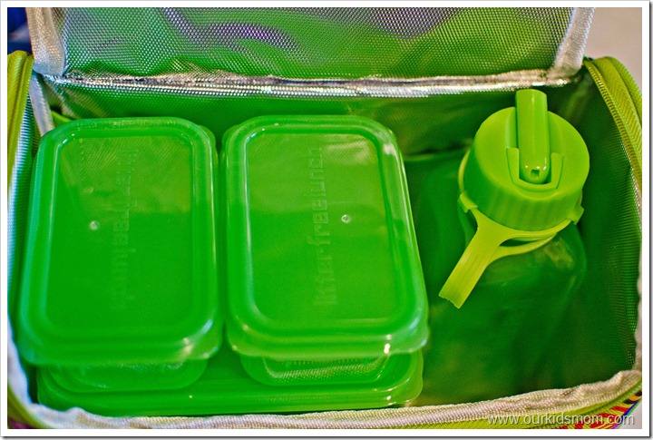 Everything about this lunch kit is pure genius. The shell is large enough for all 4 containers, the liquid container and a little extra room for napkins, a note from home or an extra little treat. I’m planning on purchasing a small reusable freezer ice pack that will fit in nicely beside the bottle.