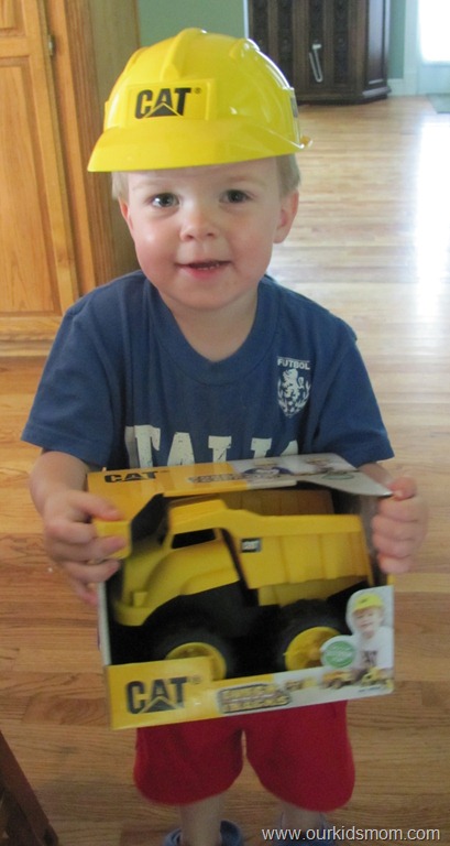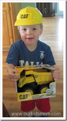 We were fortunate enough review the CAT Pre School 8” Touch Tracks Dump Truck and a CAT construction workers hat from Toy State just in time for Ethan’s Birthday Bash.