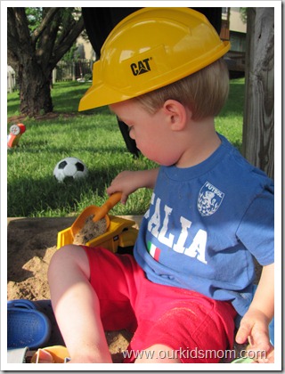 The CAT dump truck has a sturdy feel to it. I love how there are no metal pieces to accidentally scratch the kids or rust (toys get left outside a lot here). The wheels roll easily and Ethan had fun digging a roadway for the truck to drive through in the sand. The truck spent a large amount of time driving back and forth in the sandbox… they would dump a load of sand so the truck could turn around for the next load.
