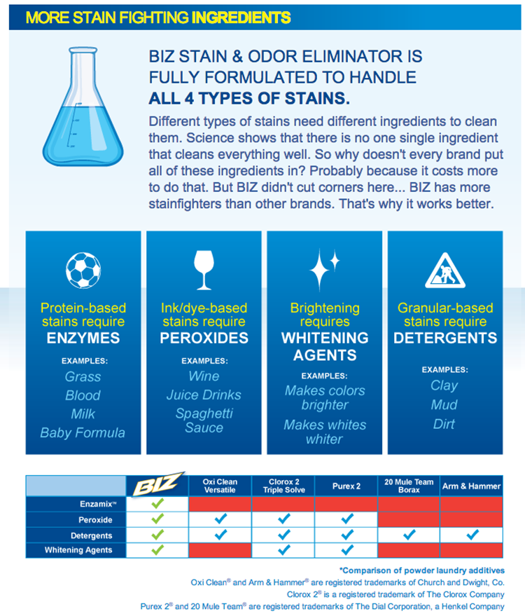 Biz gives Mom’s confidence to do more and eliminates the fear of laundry stains and odors. Biz cleans up to 80% better than washing with a detergent alone because Biz contains more stain fighting ingredients. Biz is proven to work better on tough laundry stains and they have lab tests to prove it.
