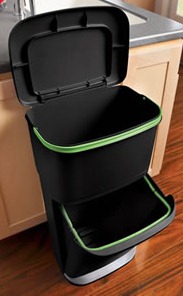 The upper bin has a lid that raises upward while the lower bin tilts out for quick use and slides out completely to empty. Both compartments have a handle to carry that doubles as a tie down for the trash bags (to keep them from slipping into the bin).
