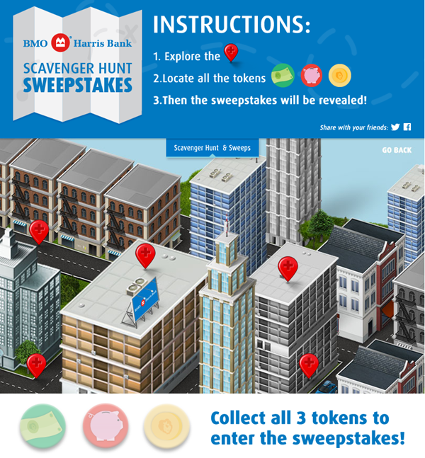 The BMO Harris Bank Scavenger Hunt Sweepstakes is a five-week long interactive game experience that offers financial tips and the chance to win cash prizes by entering a weekly sweepstakes! The game takes you through a town-like environment, highlighting key milestones in the journey of life… this week’s topic being “getting a new job”.
