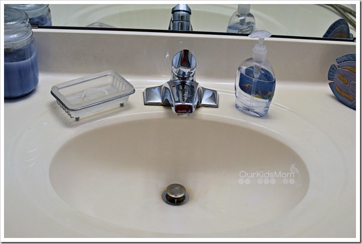 I’m loving the new faucet and the new look! I am pleased with how just the switching out of a faucet changed the look and feel of the room. It operates smoothly and easily…neither of the little kids have had a problem operating it. My favorite feature of all is the drain plug. Instead of pulling a knob behind the faucet to close it you simply push down on the actual plug. To open it, push on it again and it springs back up. The only time I could see that this wouldn’t be my favorite way to open it is if the sink contained gross water (which doesn’t happen often).
