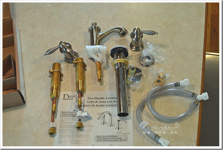 After laying everything out on the counter to take inventory we realized we needed to make a quick run to the hardware store for water supply hoses (not included in the kit). My husband picked up a few other items to fix the slap dash install the builders did and he was ready to go.