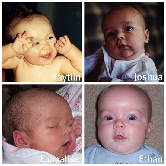 Even looking through their baby pictures for this post… I can remember some of the most insignificant details about what was going on. Every little thing has meaning to me. Kaytlin was sitting on her changing table after her bath and was playing peek-a-boo with me. Joshua was meeting my grandmother for the first time and she was holding him in the air to get a better look. Emma was snuggling after a long nursing and looked so serene. Ethan was playing on the floor and being silly with his big sister Kaytlin. Every detail is a joy etched in my heart.
