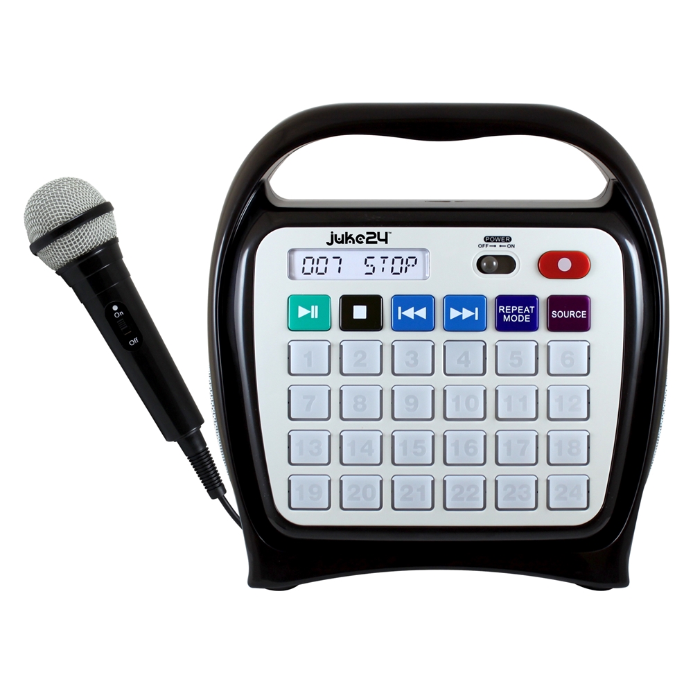 Juke 24 lets you record 24 songs using any of the following sources: CD, Aux in, MIC in, USB Key and PC Link via USB port. With a MIC that is included the Juke 24 is now a Karaoke player and your voice is heard through the speakers.