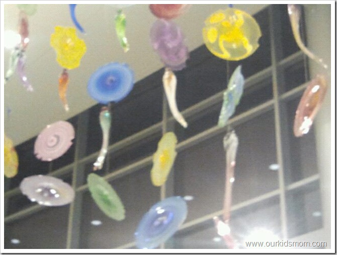 I noticed while walking into the hospital a large piece of glass artwork hanging from the ceiling. The photo is poor as it was from my phone, but still pretty.