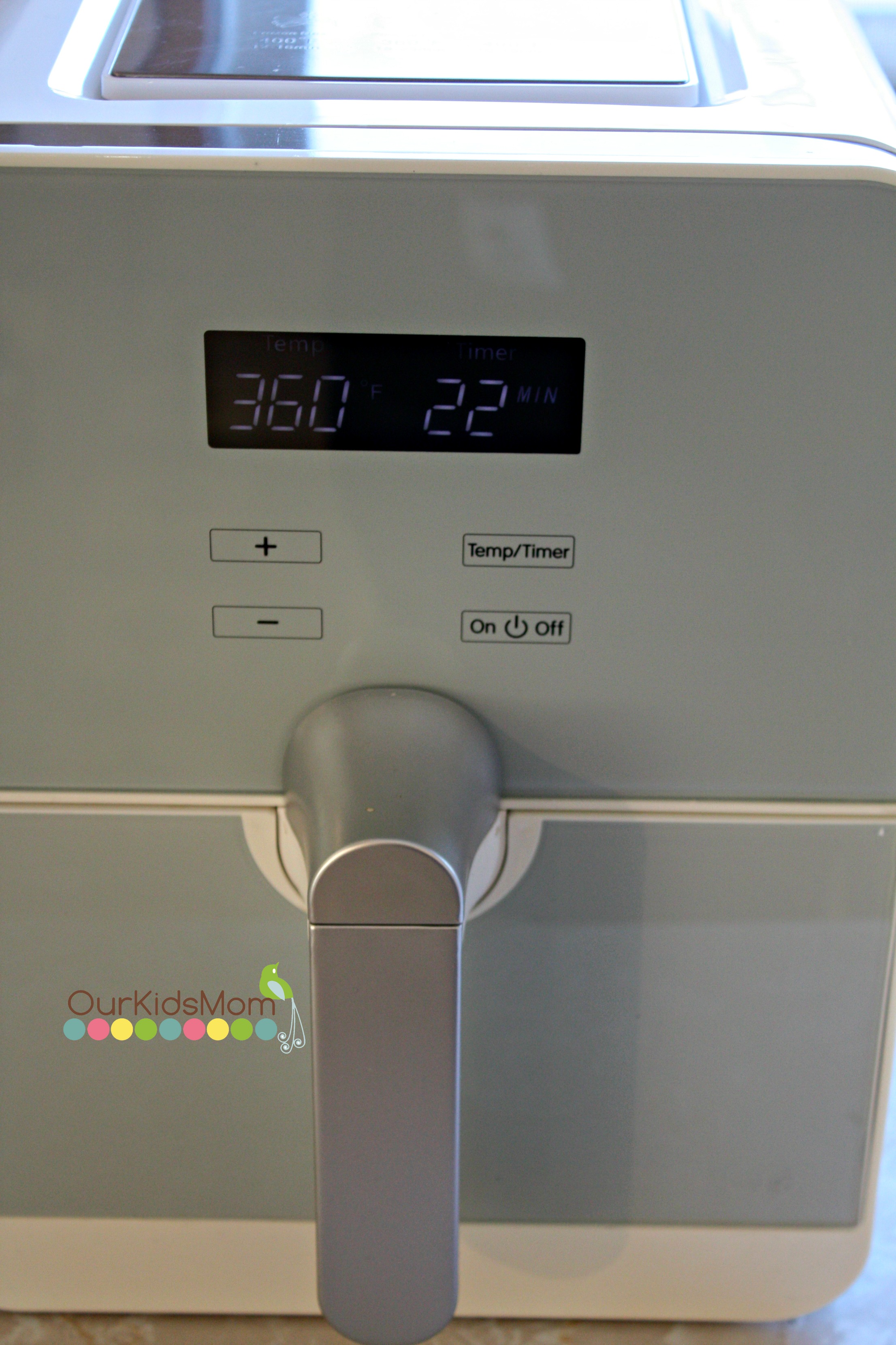 The front display is a LED glass panel with a light touch button control. You can select your temperature from 122-392ºF as well as selecting your cooking timer up to 60 minutes. There is a guide inside the manual for timing directions. Find the item you are cooking on the chart and from there it will show you what temperature to use and how long to cook it for. It will also tell you if you need any oil or if you are able to cook without using oil.