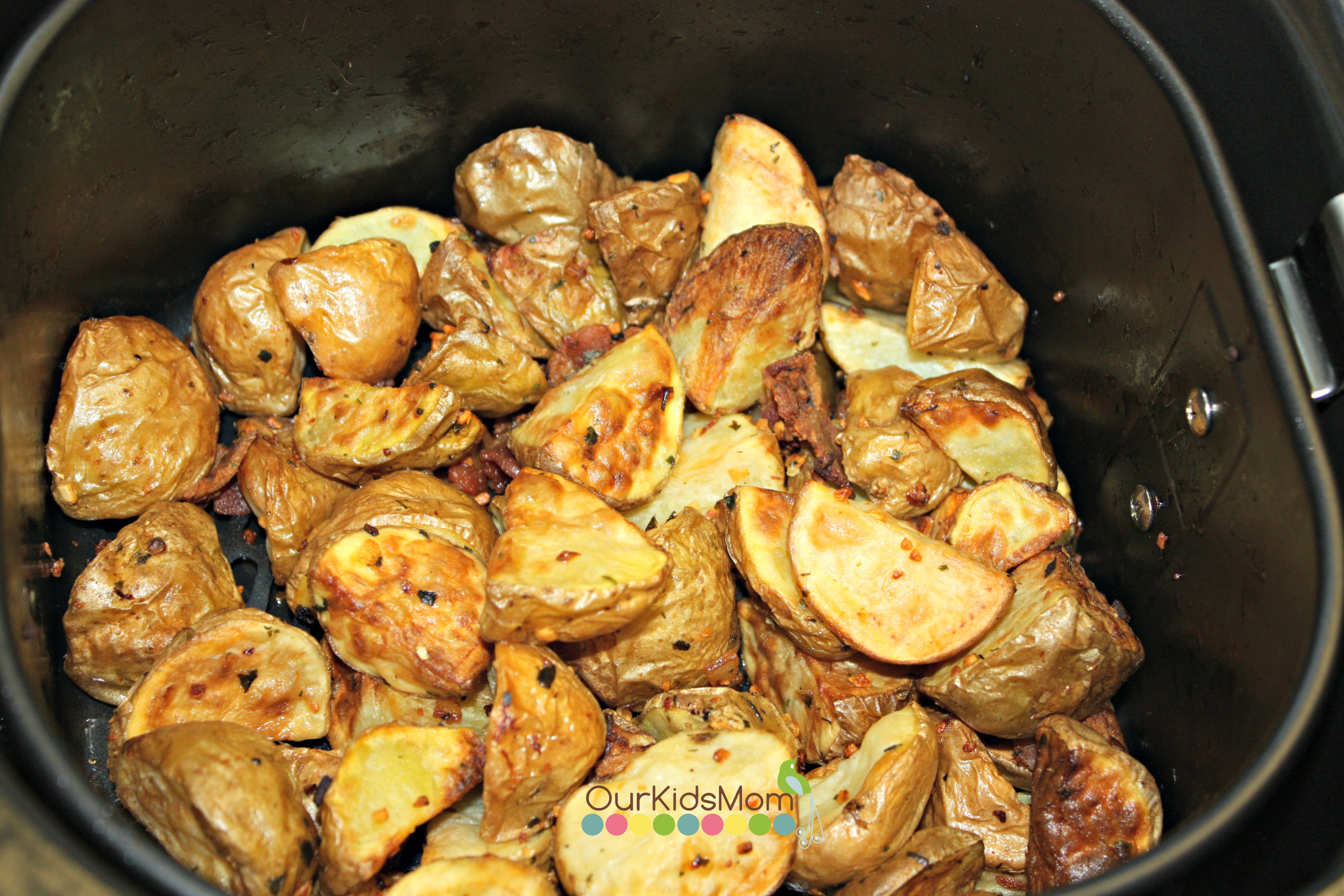 Using the Air Fryer is very simple. Open the pan and place your food into the basket, making sure you don’t over fill the basket past the max fill line. I made up some home made potato chunks, which did call for just a little oil tossed on the potatoes. I selected my temperature and the time for cooking, closed the pan up and let it cook. I did open it up half way and tossed the potatoes around. When the time finished and I opened the air fryer I was amazed at how the potatoes looks simply delicious and crisp to perfection.