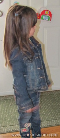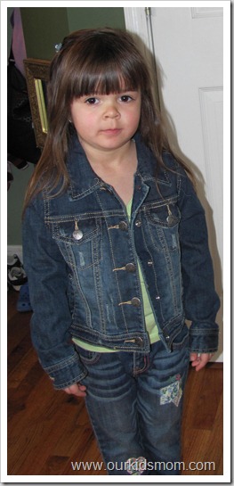 On to Emma’s second outfit. The Children’s Place sent her a pair of patchwork jeans, a cotton t-shirt and a jean jacket. Again, I will admit I probably never would have purchased a jean jacket for Emma, but as soon as it was on her I fell in love. I am quickly learning to let her try things on before I judge them!