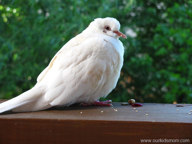 Thursday morning I awoke with every intention of getting my daily giveaway written and posted. I made my coffee, set the table with my laptop and had a seat. Then my oldest son came downstairs and told me about a dove my husband found sitting in the bush at the bottom of our front steps.