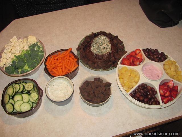 This year we had a plan. I hosted for my family and took control of the menu… putting out healthy snacking options to help fill our bellies before the pizza was served. I really think it helped. When the munchies hit after the pizza (and you know they always do) I headed straight for the cucumbers and cauliflower. I allowed myself to indulge in the ranch dip (made with low fat sour cream) and a little of the spinach dip with pumpernickel bread (yumm). The fruit dip I normally make is so not on the plan, so I opted for strawberry yogurt (which is incredible with strawberries, apples and even pineapple!).