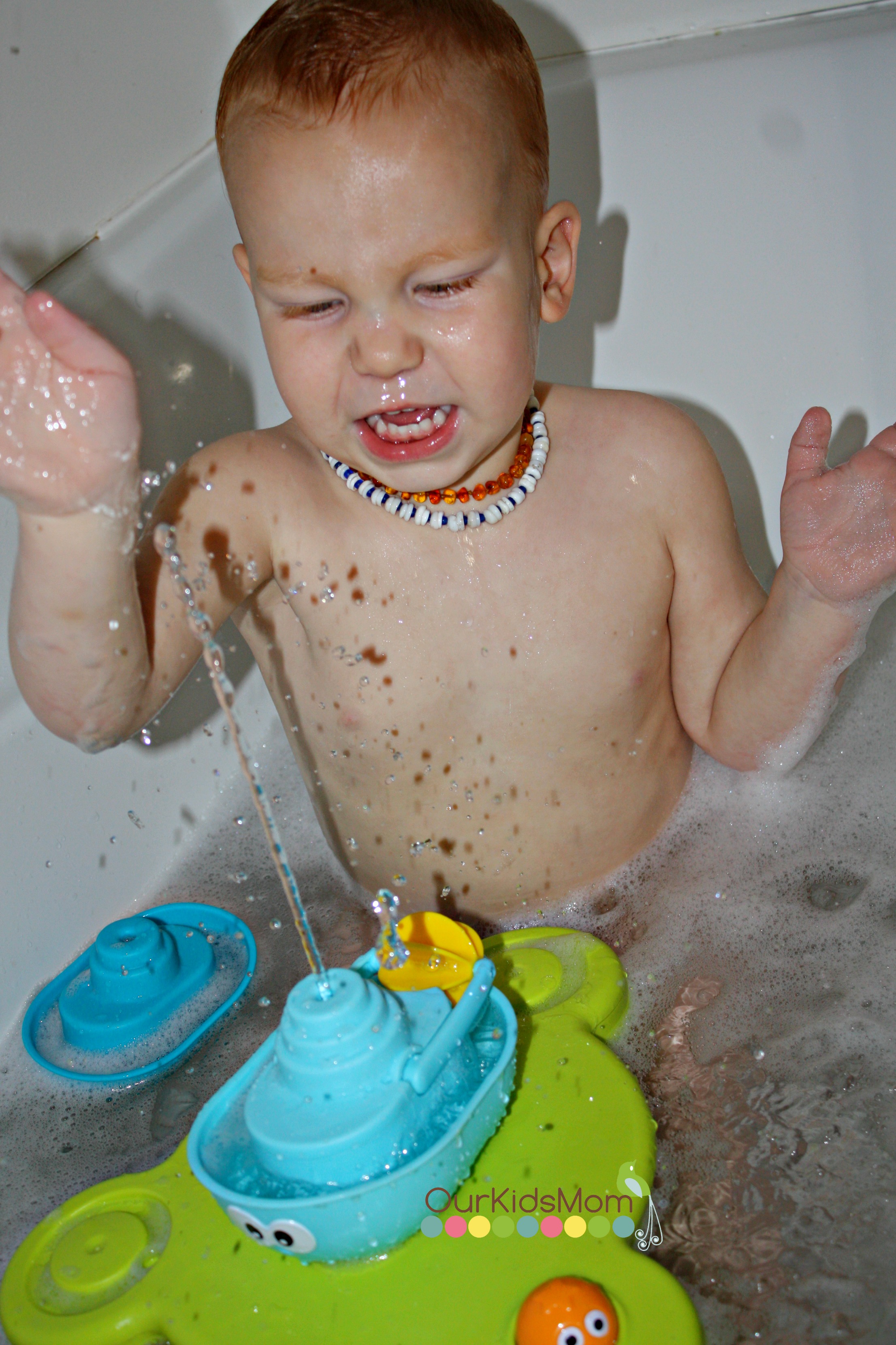 The Stack ‘N’ Spray Tub Fountain is battery operated and is great for promoting hand eye coordination, cause and effect, as well as teaching them simple concepts as full/empty, high/low, float/sink, and on/off. The on/off button is the little character on the floating island that is a simple push to start and stop your water pump.