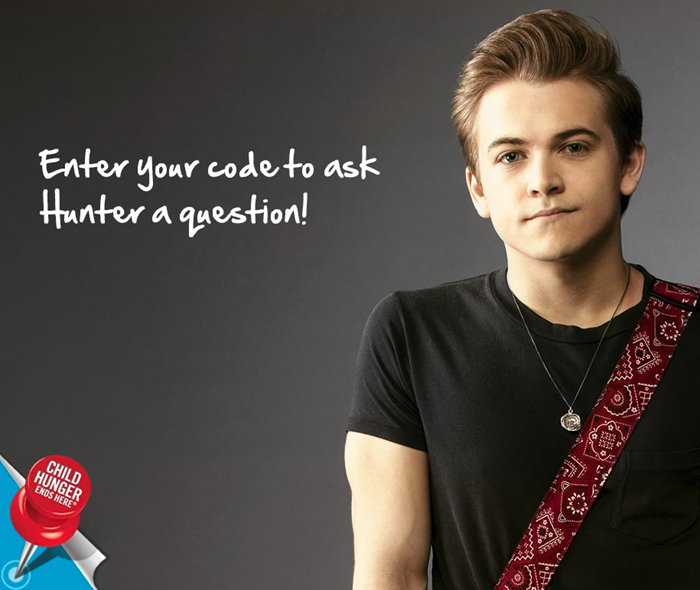 Just enter a code on www.childhungerendshere.com for the chance to ask Hunter Hayes a question. Each month through August 2014, Hunter will personally answer one question (using the winner’s name!) and post the video to the Child Hunger Ends Here Facebook page.