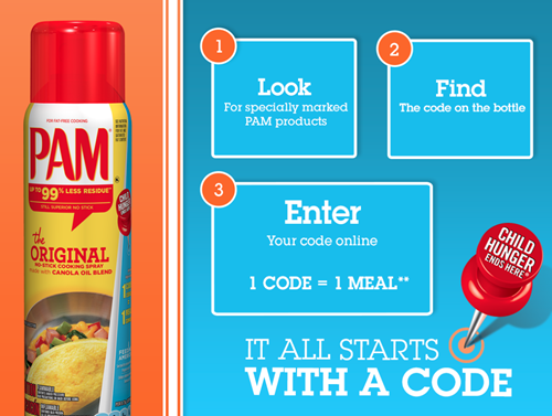 For each 8-digit code entered at www.ChildHungerEndsHere.com from March-August 2014, ConAgra Foods or P&G, respectively, will donate the monetary equivalent of one meal to Feeding America.