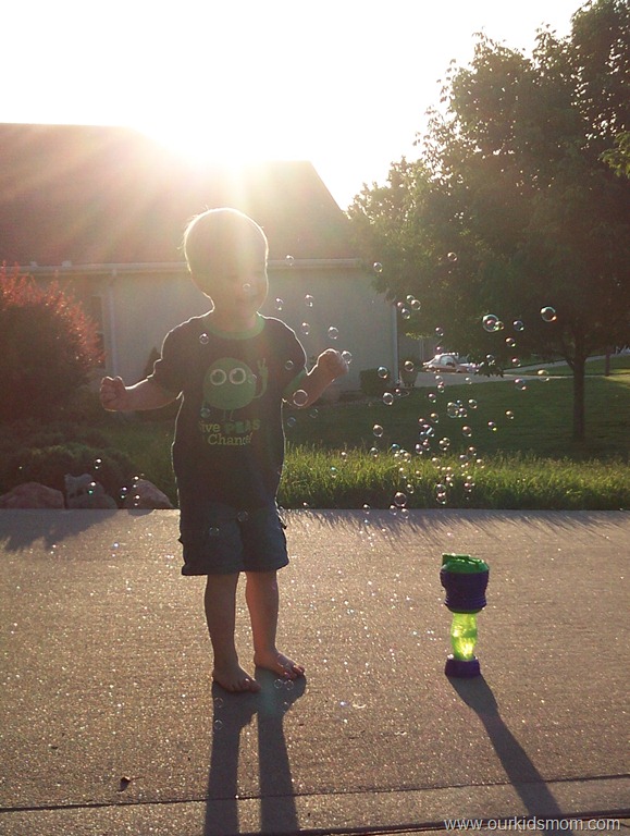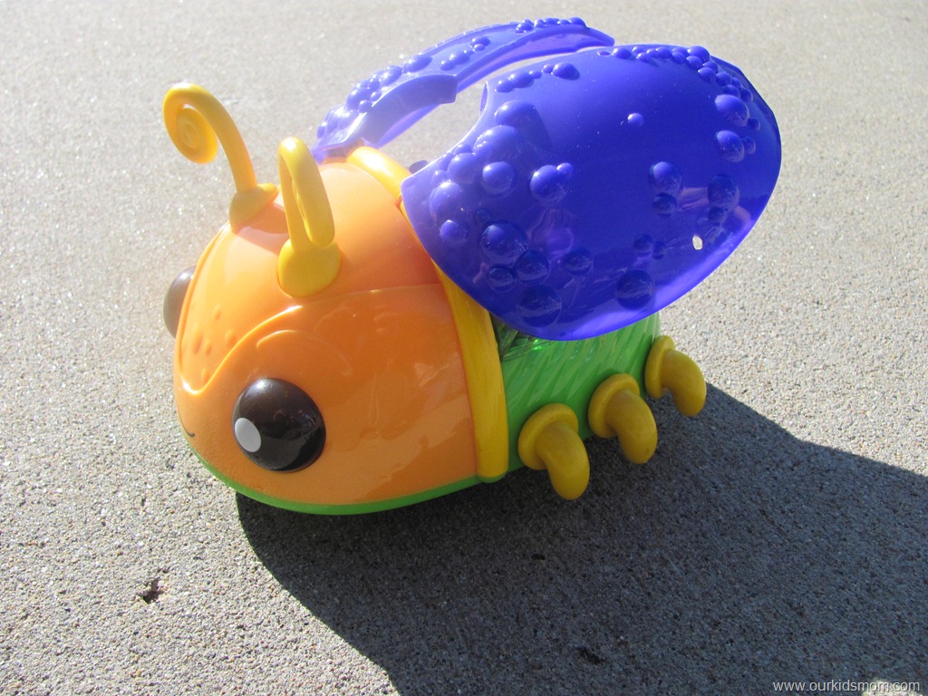 We turned the Bubble Bug on in our driveway, which probably wasn’t the best idea (you will see it in the video). Our driveway is set on a slope and the bug kept wanting to go down the hill and kept getting stuck in the cracks. When we moved him down at the end of the driveway he was more fun and the kids chased him while he left his trail of bubbles behind him. I would say if you have a more flat surface than we did, the Bubble Bug should bring you tons of enjoyment.