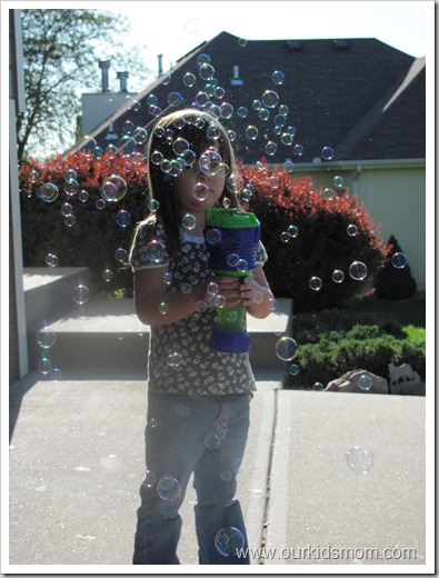As you can see from the pictures and the video (please excuse the whiny girl… we skipped our naps that day), the Cyclone can produce a large amount of bubbles. It doesn’t seem like much on a windy day, as it is blown away as fast as it’s pumped out… but we tried it again on a more calm day and the kids had a blast. I was impressed at how little bubble solution disappeared during use. We have played with this toy several times now for lengthy periods and the bottle is only half empty!