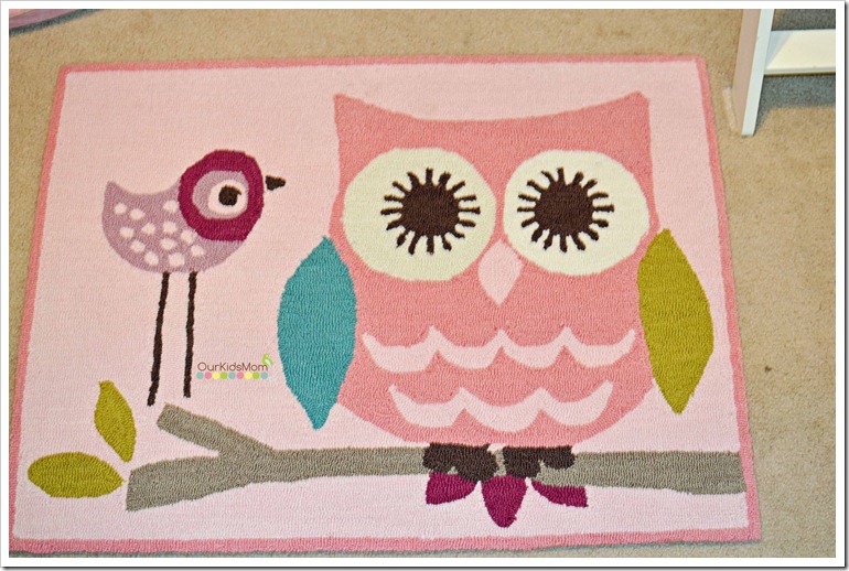 The owl rug is a good size at 30″x40x”0.375″ that filled just the right amount of space on the floor. I am in absolute love with this adorable owl and his buddy the bird would be living in my own bedroom if my husband didn’t have anything to say about it. It’s a great quality rug that accents and brings out the green in her wall perfectly.