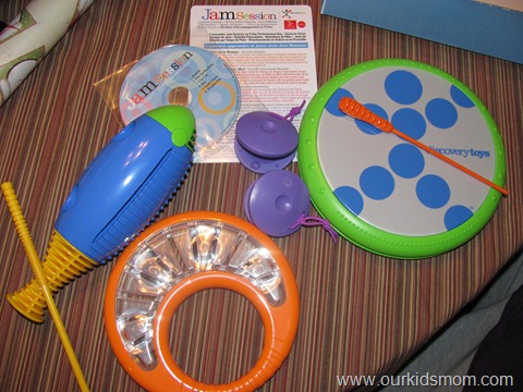 So how about playing music, too?? We allowed the children to open both sets of musical instruments for less fighting. The Discovery Toys Jam Session was very well constructed and was easy to use. We tossed in the CD to allow the children to play along… and well…. take a look at what happened!