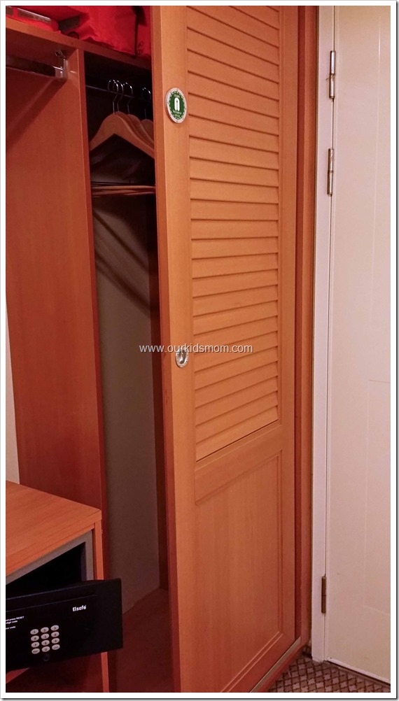 The closet includes a programmable safe, a few cubbies we used for shoes and a small amount of hanging room.
