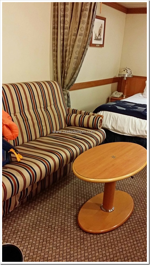 Walking into the room you immediately see the couch to the left and the bed centered on the back wall of the room. Our bed was two twins pushed together. Our older children were next door in 7127 (layed out like the floor plan above) and they asked our stateroom host to separate the beds into two twins. This pushed the beds against the walls and the two bedside tables were in the middle. I felt like it created a lot more usable space for them.