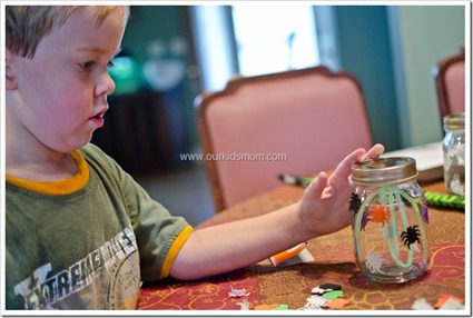 This Spooky Glow Jar activity takes minimal supplies (all were purchased at the Dollar Tree) and is something I can let Ethan do start to finish. Seeing the look on his face when we sit side by side making our own crafty items together… it’s worth every penny (and more).