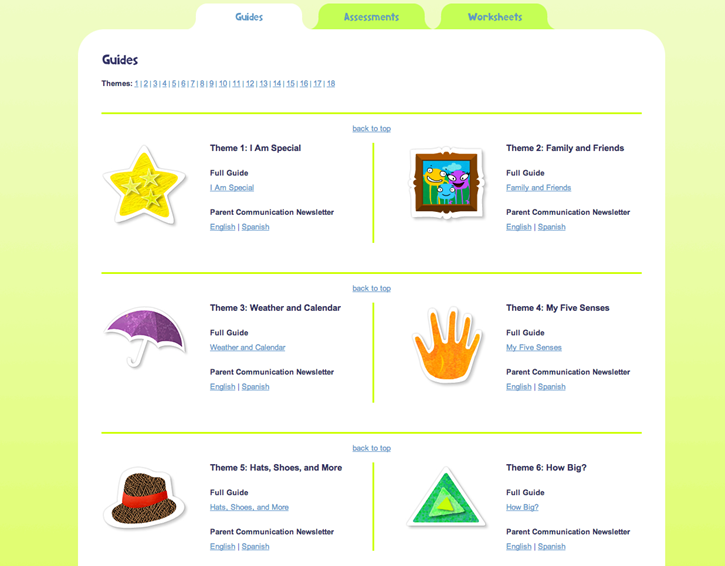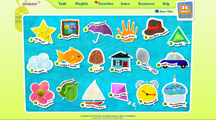 EmbarK12 Online has 18 thematic units covering 6 subjects: Math, Language Arts, Science, Social Studies, Music, and Art. Examples of themes include: Family and Friends, My Five Senses, and Looking at Animals.