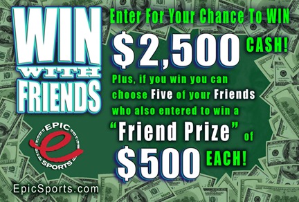The grand prize is $2500 and the opportunity to choose up to 5 of your friends to win $500 each! Only those who enter can win, so the winner’s selected friends need to have entered as well in order to be eligible to win the “friend prize,” but Epic Sports makes that easy with the share feature added into the entry process.