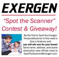 There is No Purchase Necessary to participate in the contest. During the contest period, you may access the contest by visiting www.exergen.com/spotthescanner and via the contest link on the Exergen Fan Page. The Exergen Temporal Scanner is not guaranteed to appear in every episode of Grey’s Anatomy. In the event that it does appear, the first 5 (five) people to email spotthescanner@exergen.com with the name of the person who was holding the scanner (specific doctor), the time you saw the scanner as well as full name and mailing address of entrant will win 1 (one) Exergen Temporal Scanner home model. Limit of 1 entrant per email sent/received and one prize per household.