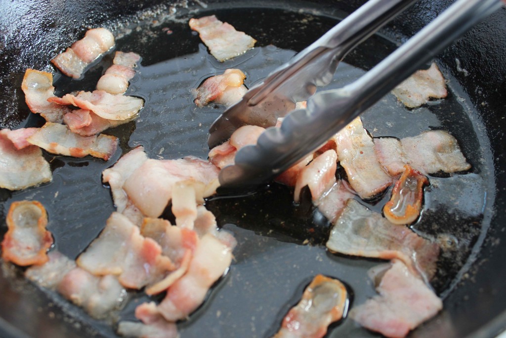 Slice bacon into 1″ pieces and fry until cooked but not crispy. Allow to drain. Reserve bacon grease.