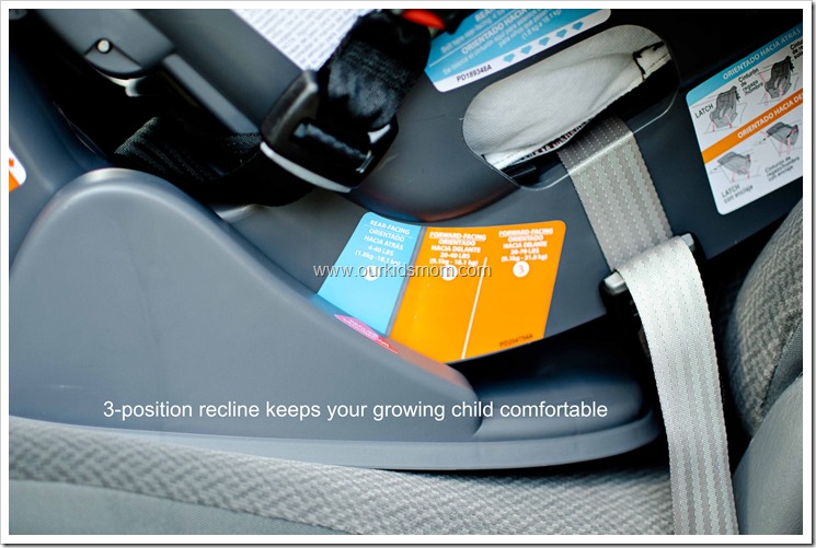 There are 3 incline positions, 1 for rear facing and 2 more upright positions for forward facing. Adjusting the recline is as easy pulling the red recline lever and sliding the seat on it’s base.