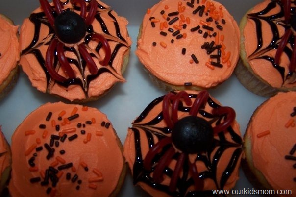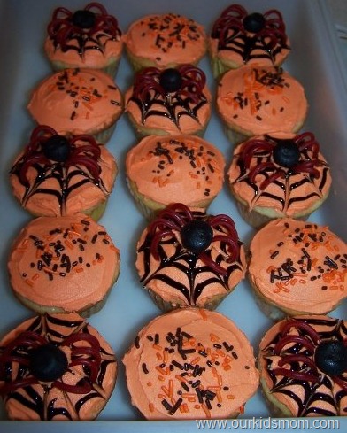 Place a black Halloween DOT candy in the center of each spiderweb. I then cut a Twizzlers Pull –n- Peel into pieces and pushed each end into the cupcake to form the legs.