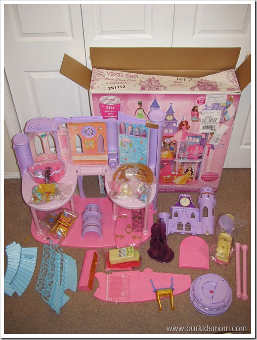 Beware when you purchase this for your little girl that it comes in many pieces. That being said, the instructions are pretty straight forward. It guides you through the first 10 steps or so and then there is one large diagram that shows you where everything else goes. It takes about 20-30 minutes to assemble. Also be aware that this set does not come with dolls/princesses. If you purchase this as a gift be sure that your recipient has a few (Barbie works just as well) or you pick up one or two.