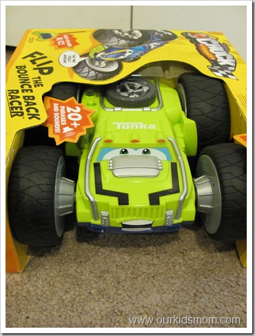 My overall opinion of FLIP is a good one. I got past the fact that I needed 6 AA batteries for the car and 2 AA for the remote (doesn’t that seem like a lot?) when I saw Ethan smiling. It is a fine basic beginner’s remote control car. It seems durable, has the fun factor of flipping over when moving it back and forth and the kids can run it into the walls without causing damage. By the time Ethan is bored with only going forwards and backwards we’ll think of upgrading him to a bigger boy remote control car.