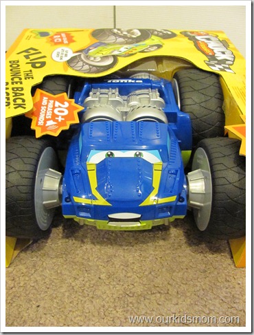 Ethan loves cars, trucks… anything with wheels. The only thing that would make a car better in his eyes is if it moves on its own. Now there is that option for little guys. Meet FLIP The Bounce Back Racer.