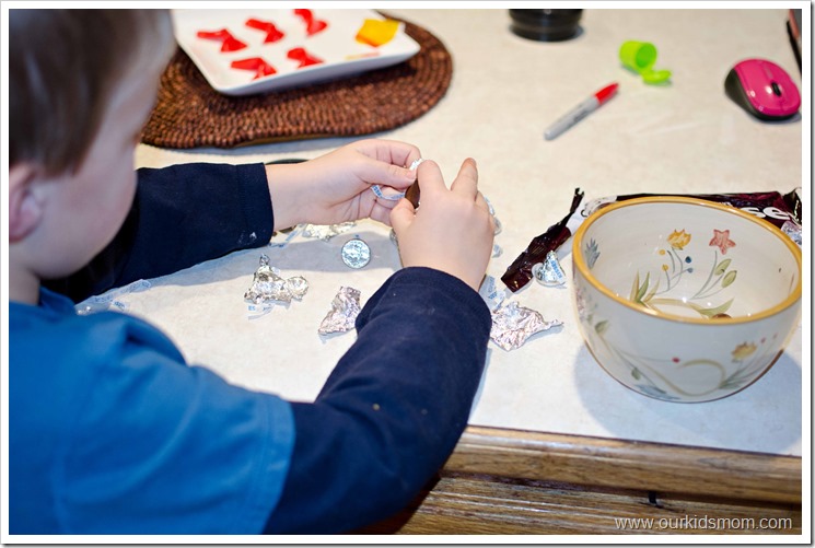 While your oven is heating to 375 degrees, have your helper remove the wrappers from the Kisses. Ethan enjoyed this as we only needed a small portion of the bag, so he ate them as he unwrapped.