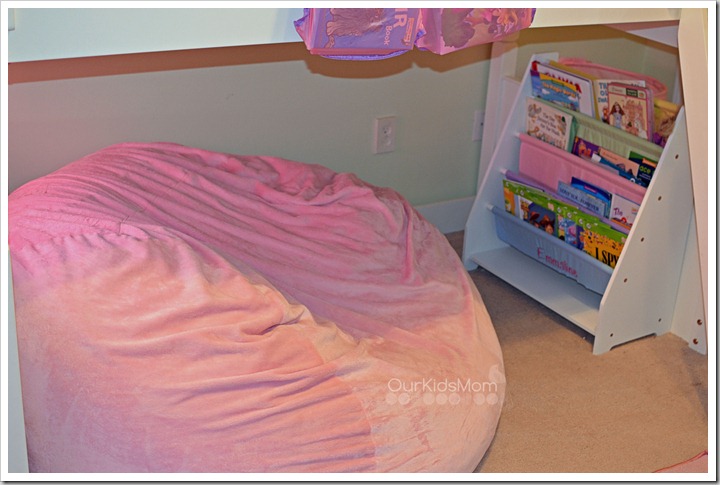 Recently we have been on a hunt for a “better” bean bag chair that would withstand two rambunctious children. Back in April Emma received a new loft bed. Up until recently we have had a cubby system and her princess castle underneath. It was functional, but very cluttered looking. The cubbies were only being used for books, Barbies and dress up clothes and her princess castle was only used when company would come over (rarely) to play. With Emma heading to kindergarten we thought that a nice “reading nook” under her bed would be more functional (and less cluttered) as well as be more suitable age wise for a longer length of time.