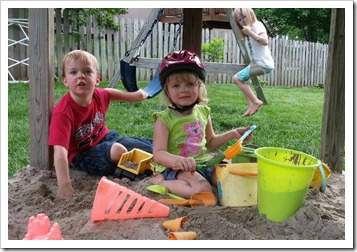 Maddie was over the moon with her new helmet and wore it while riding her bike… and continued to wear it throughout the afternoon even though it was warm out because she loved it so much! You never know what might fall on your head while playing in the sandbox, right?