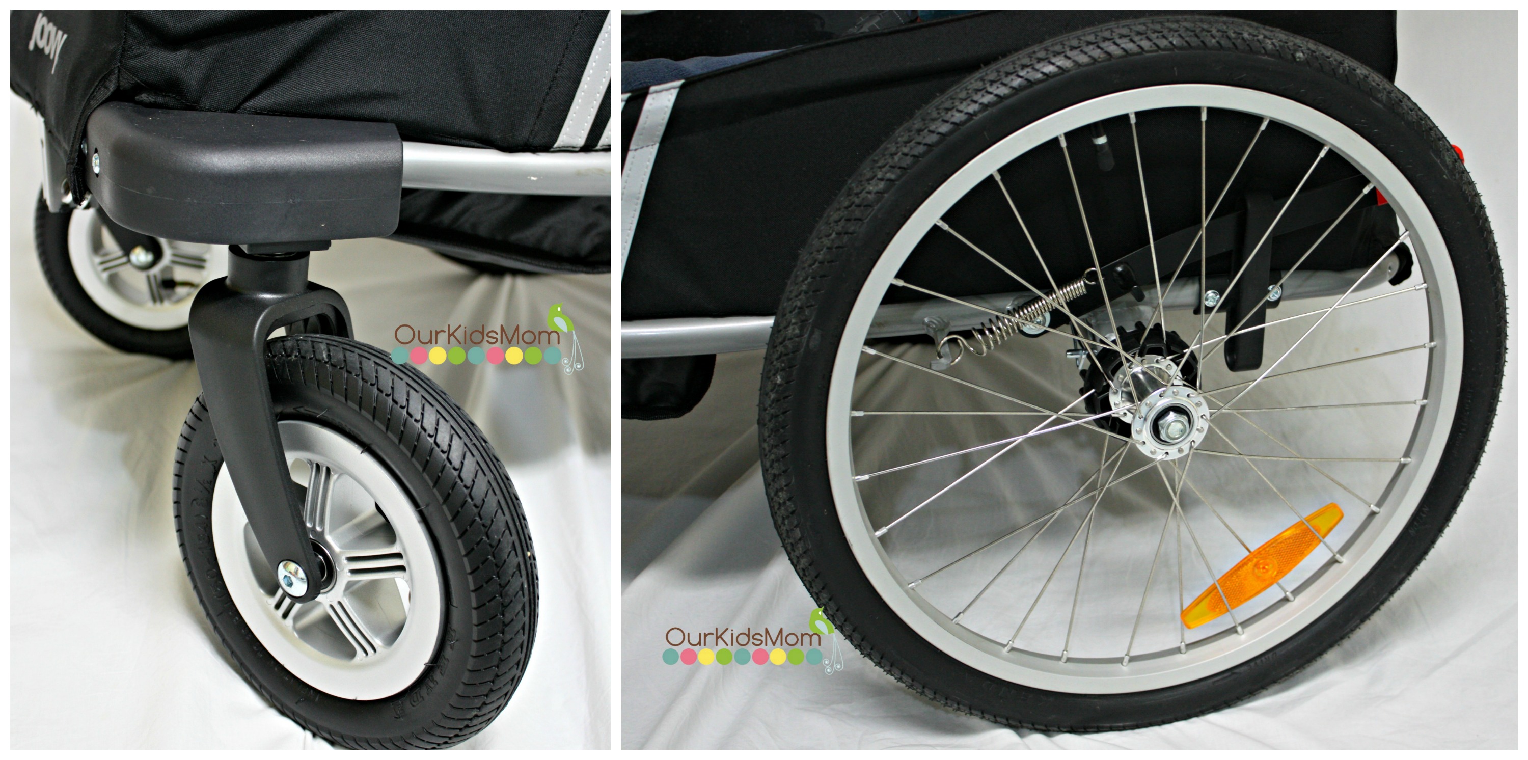 The front wheels are on a swivel which I find gives me easy and smooth maneuverability. The rear wheels are a large 20″ pneumatic tire which makes for a smooth comfortable ride. I find the stroller is amazingly easy to push… you hardly have to push at all.