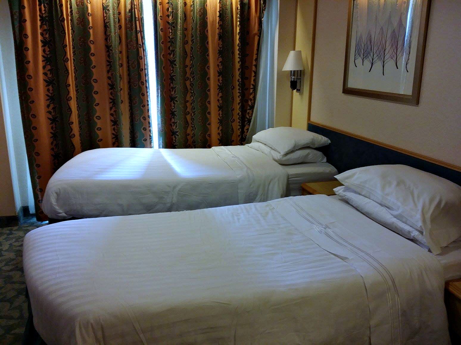 The card on the bed mentioned pulling the beds apart, which we requested. I had worried about the amount of room we would lose when separating the beds, but there really wasn’t a space issue at all. The bedside table that was near the sliding doors just shifted over to go between the beds.