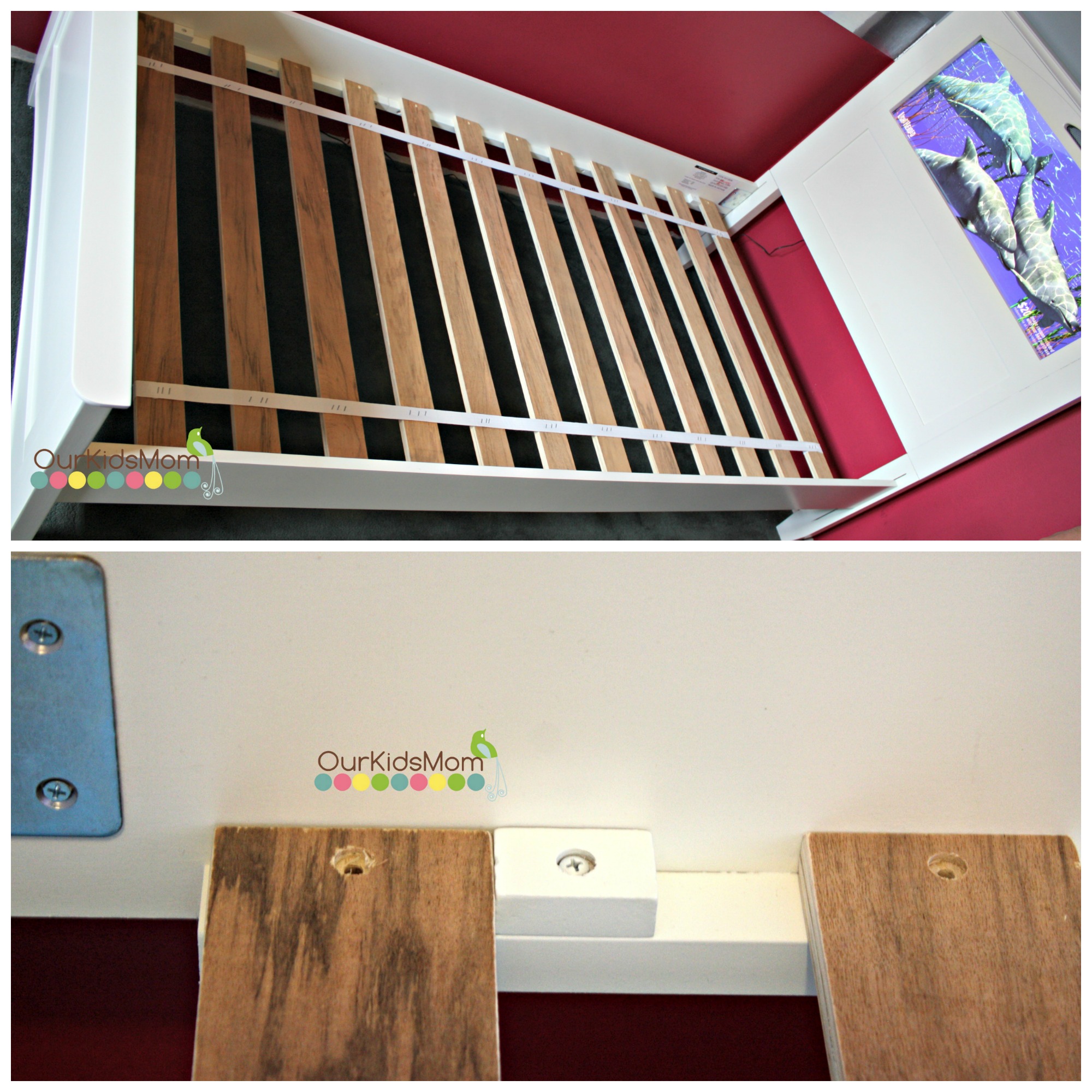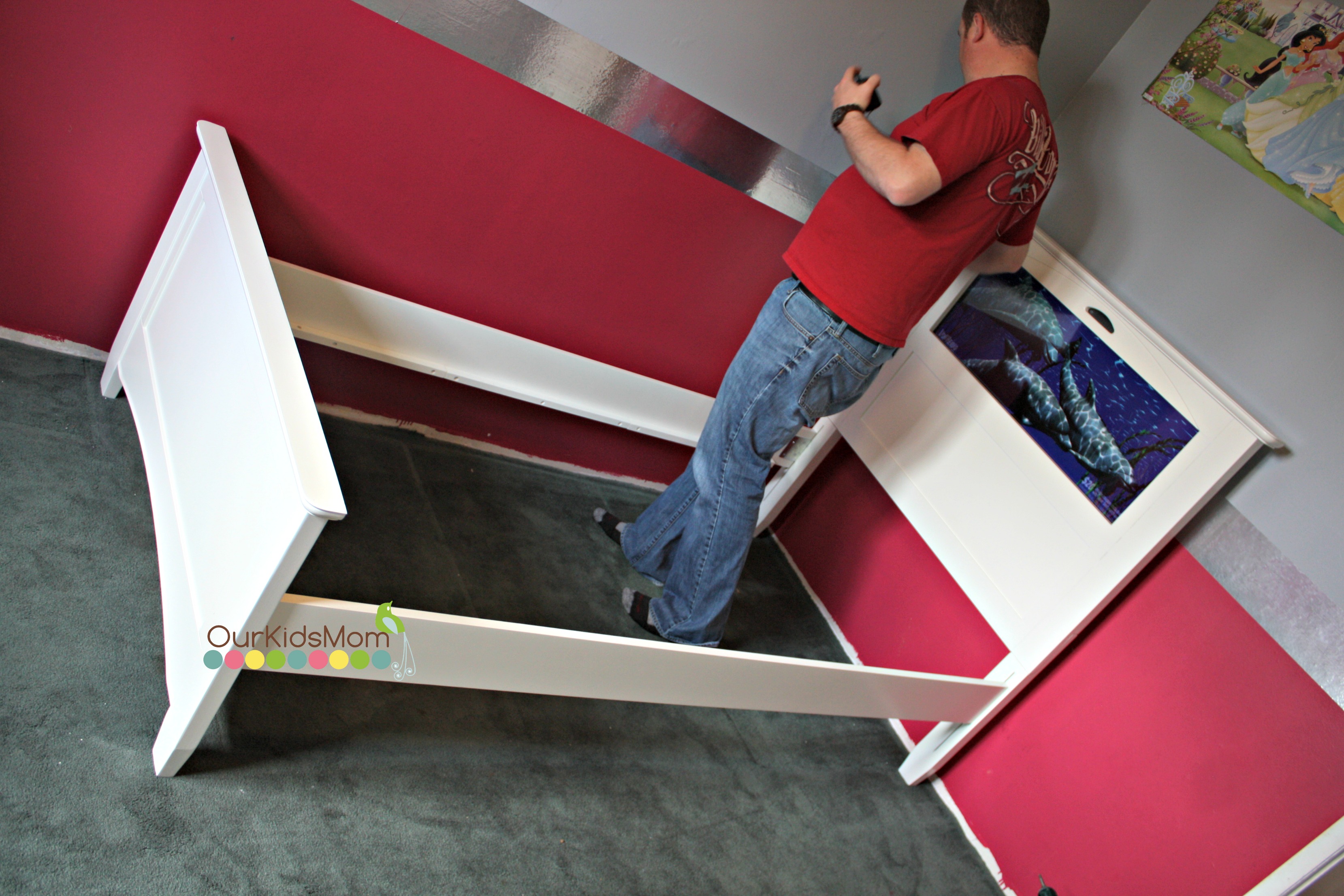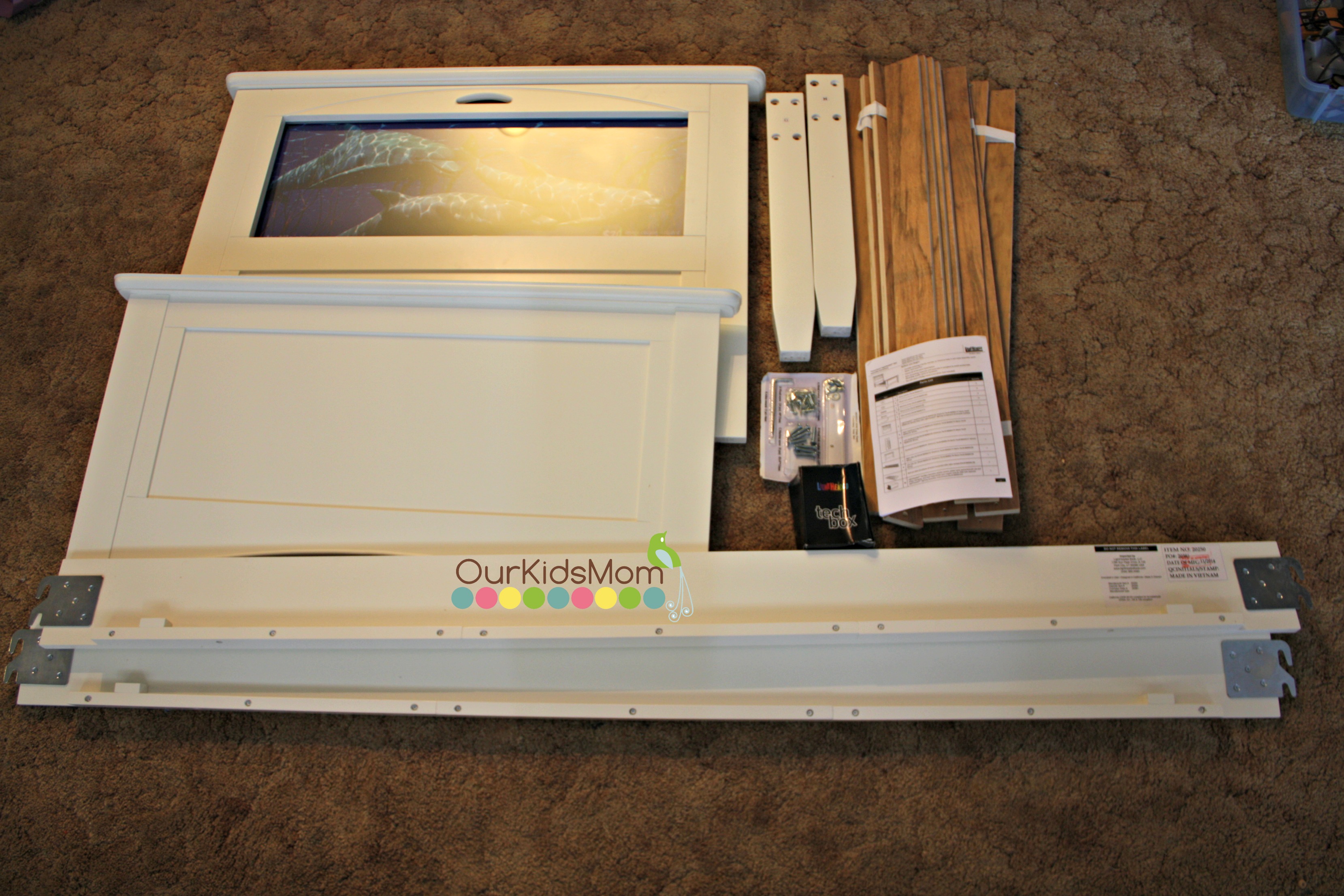 Screw the boards to the side rail, plug in the headboard and your done. As you can see above, the bed comes with a pretty dolphin image.
