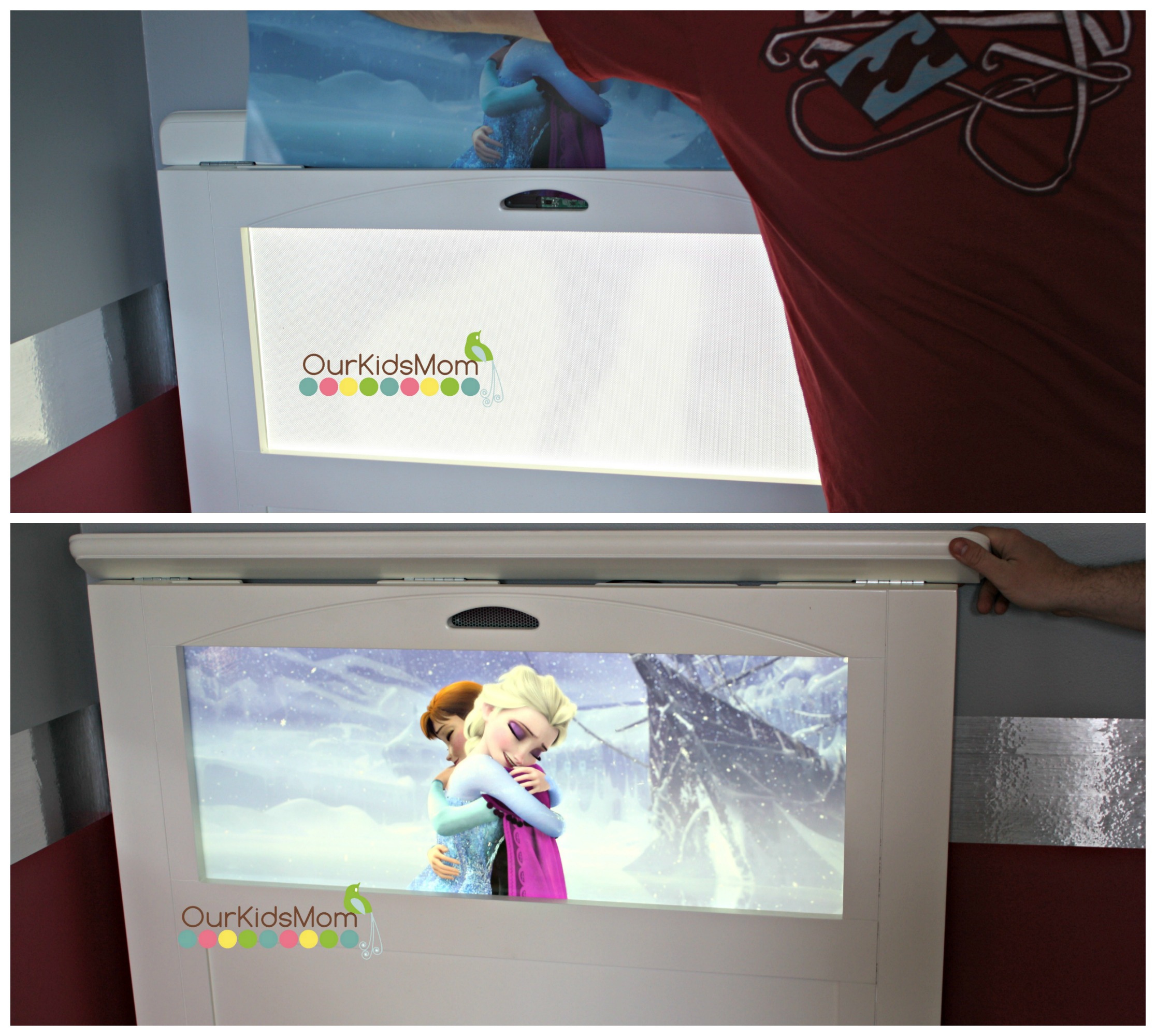 The headboard is amazing and so much fun. The top of the headboard lifts up and opens so you can slide your image in. The bed comes with a remote control to turn your head board on and off and you can set a timer in 15 min intervals from 15 min-60 minutes. If you don’t want it to stay on all night it will turn off automatically. There is also a dimmer so you can control the brightness of the image as well. I love that you can set the image for let’s say 60 min and have it fade out at 60 min so there is no waking from an instant darkness.