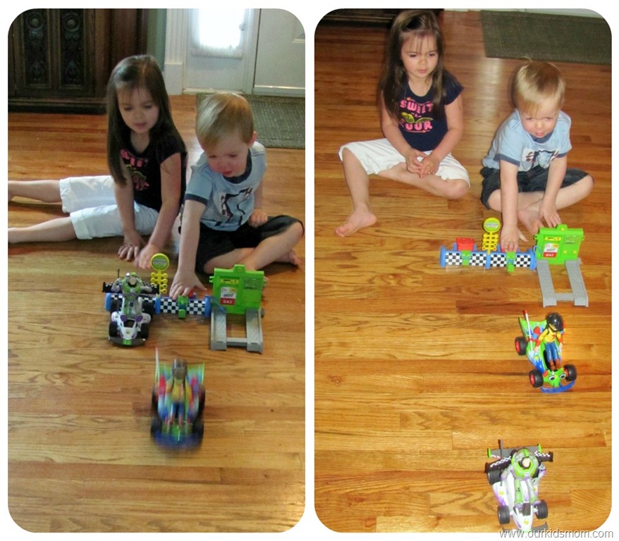 Ethan had fun putting the figures on the vehicles and setting everything up. Emma actually spent quite a bit of time backing the vehicles up onto the ramp and “fueling” them up with the gas pump. The imaginative play that has been happening with these Toy Story toys has been incredible. They even set up their own race a few times but were then distracted and started reenacting the movie and pushing the vehicles around the house.