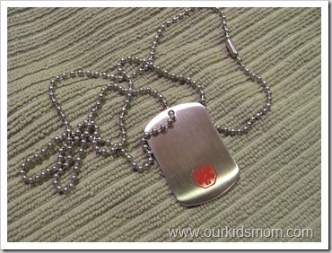 As you can see from the photo above, in the end he chose a standard dog tag medical ID. It’s stainless so he doesn’t have to worry about removing it to shower (because I know he would forget to put it back on) and the length is just right at 22 inches. They were able to engrave enough information to get the right type of help for him if he were alone, confused or they couldn’t wake him up.