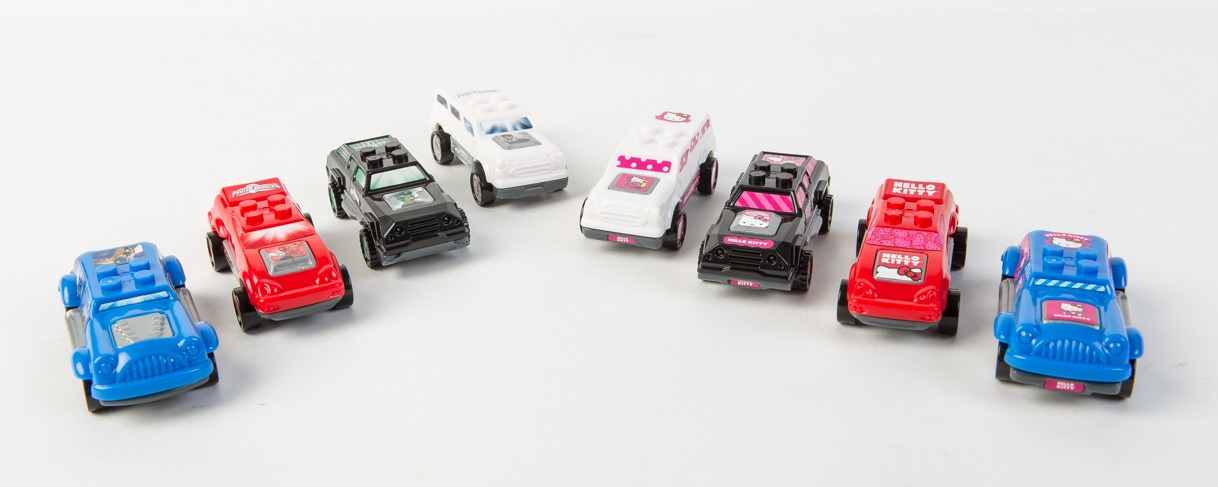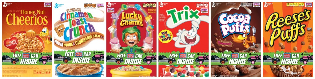 Each participating brand of General Mills cereals including, Honey Nut Cheerios, Reese’s Puffs, Cocoa Puffs, Lucky Charms, Golden Grahams and Cinnamon Toast Crunch, offers a free Mega Bloks car with a set of Hello Kitty and Power Rangers stickers and instructions to cut out a pattern to construct a cardboard jump from the cereal box.