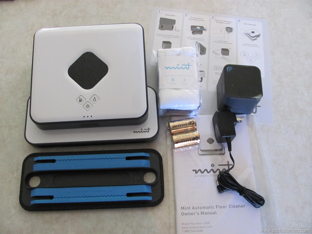 The Mint Cleaner came with everything seen above. It uses either reusable cloths (it comes with a sweeping cloth and a mopping cloth) or disposable ones (dry or wet) like Swiffer, Pledge and off brands. That cube you see on the right side is the GPS tracking device that helps the Mint keep track of everywhere it’s been so it cleans every inch of your flooring. I put the batteries in the GPS and plugged the Mint in to charge. The wait for it to fully charge was excruciating because I was so excited to see what the Mint could do for me!