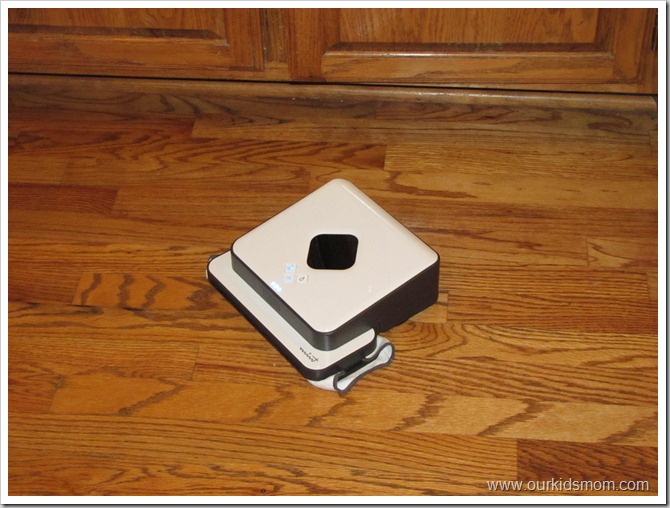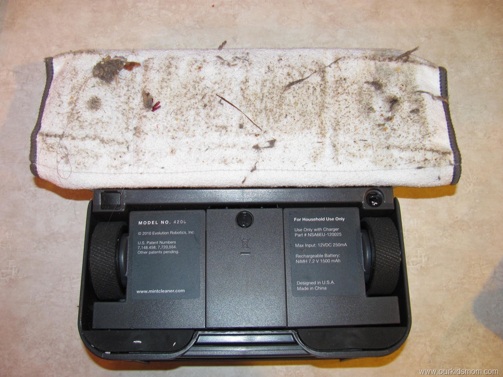 Once fully charged, my first order of business was to sweep the floor. This had been done manually earlier in the day, but with two kitties and two messy kids my floors are in constant need of sweeping. I laid the reusable cloth out flat, placed the pad holder on top and pushed the ends into the holes (just like on a Swiffer sweeper). The cloth holder has strong magnets on it that hold it in place on the Mint so I quickly placed the holder in place, put the GPS in a central area on the counter, turned the GPS unit on and pressed the sweep button on the Mint. That’s it. That is all I had to do to sweep my floor.