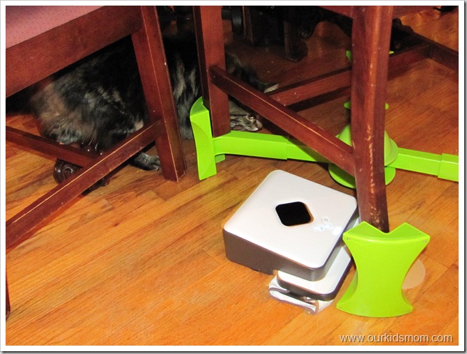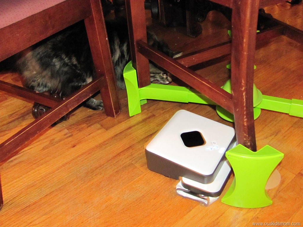 I stood and watched the Mint navigate the corners, turns and obstacles in my kitchen while it swept the floor. I was amazed how a little machine could be so “intelligent”. You can see one of the reasons I need the Mint in the photo above. Mocha wasn’t sure if this was a large white mouse or another remote control car that the kids torture the kitties with.
