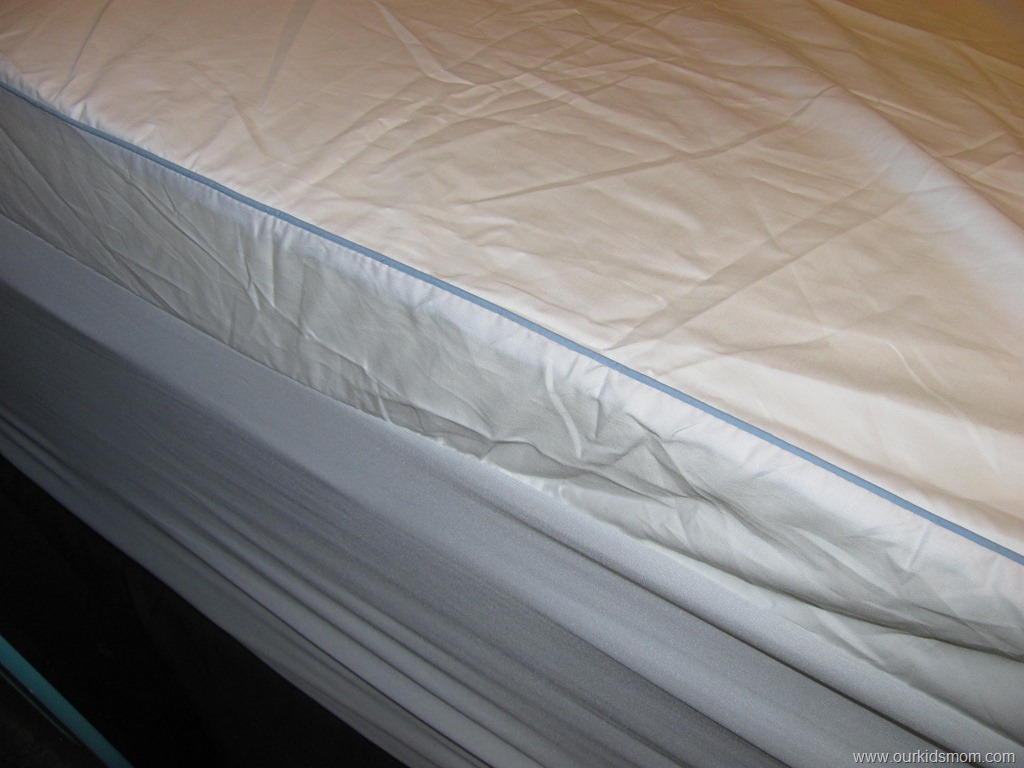The cover slides over the memory foam topper and your mattress to keep it in place and protect your investment. I like this particular method, as my experience with other toppers are they zip open like a sleeping bag and it’s difficult to readjust if it happens to slide around. That being said, Kaytlin has had no issues with the Nature’s Sleep topper sliding or moving. She has a very old mattress without the pillow top so the cover is a little baggy on the topper. This is good news for pillow top owners, though, as it has ample room to cover and hold on so you can avoid the “slide up” that happens with sheets that don’t fit well.