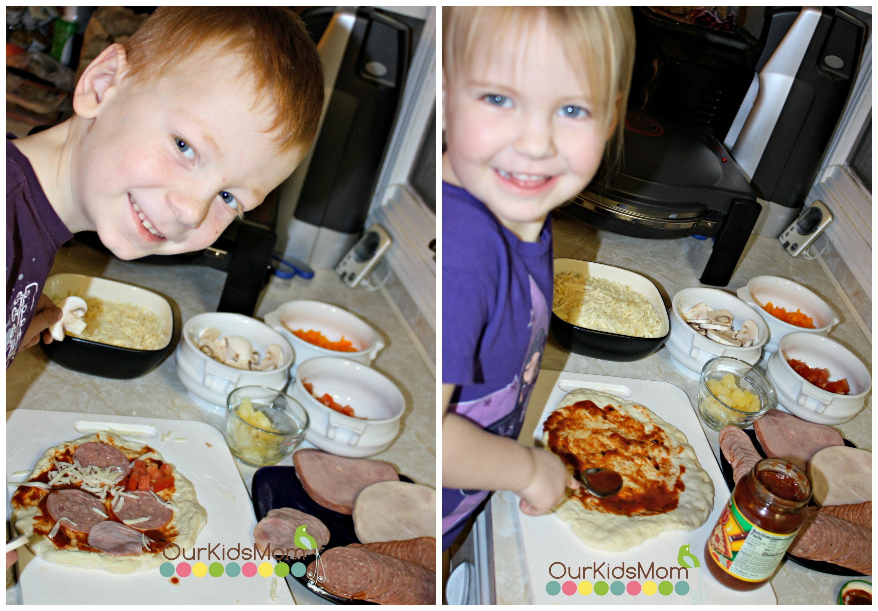 So it was pizza night in the house and I got all the ingredients in bowls and let the kids make their own personal pizza. They were so excited to make their very own pizza and got into it. I did make sure they were not too close to the pizza oven while making their pizza as the outside of the oven did get very hot.